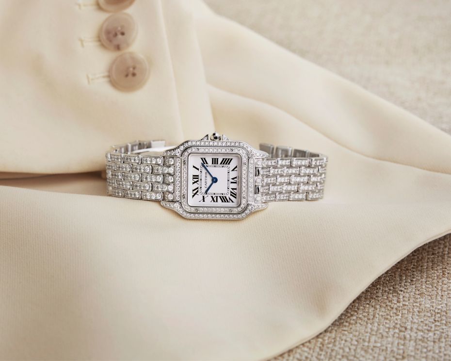 เรือนเวลาปองแตร์ เดอ คาร์เทียร์ (Panthère de Cartier) เผยออร่าในเวอร์ชันประดับเพชรทั้งเรือน ส่วนสายประดับเพชรกว่า 370 เม็ด ประกอบกับเพชรอีก 106 เม็ดบนตัวเรือน สร้างประกายแสงระยิบระยับที่เคลื่อนไหวราวกับมีชีวิตอยู่บนข้อมือ ทั้งหมดลงตัวอย่างสมดุลด้วยหน้าปัดมินิมัลอันเป็นเอกลักษณ์ของปองแตร์ เดอคาร์เทียร์ไว้ ทั้งพื้นหน้าปัดสีเงิน รางบอกนาที เข็มทรงดาบสีน้ำเงิน รวมถึงซิกเนเจอร์ลับประจำรุ่น ส่วนเม็ดมะยมยังประดับด้วยเพชรเจียระไนแบบบริลเลียนท์คัต เพื่อเติมเต็มความแววาวขั้นกว่าได้อย่างงดงาม