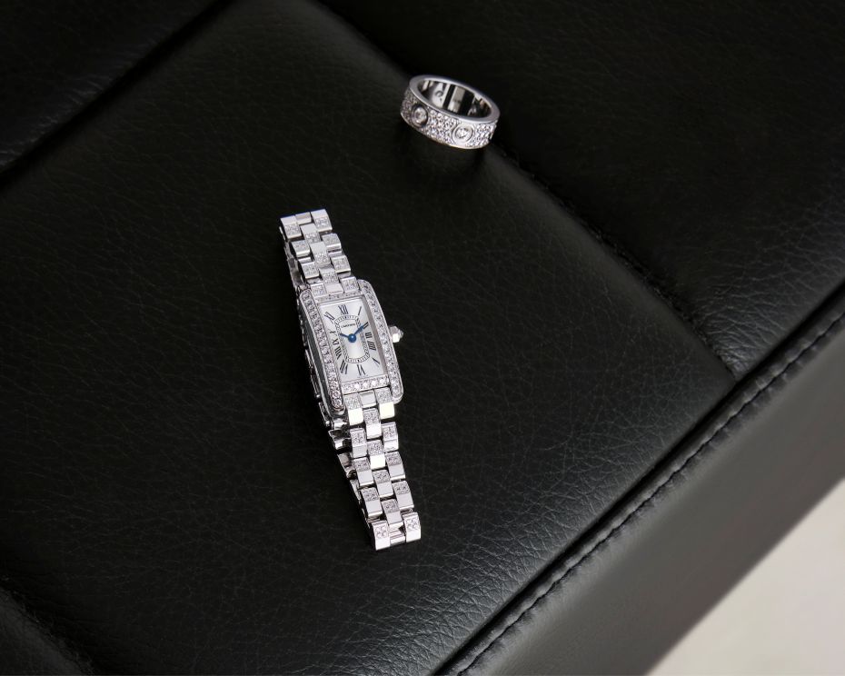 แทงก์ อเมริกัน (Tank Américaine) รุ่นมินิ การประดับเพชรกว่า 569 เม็ด ได้เปลี่ยนเรือนเวลานี้ให้กลายเป็นเครื่องประดับสำหรับยามราตรีอย่างแท้จริง หน้าปัดมาพร้อมผิวสัมผัสซาตินสีเงินที่โอบรับกับแนวข้อมือไว้ โดยยังคงรายละเอียดสำคัญของนาฬิกาแทงก์ไว้อย่างครบถ้วน ทั้งดีไซน์โครงตัวเรือนอันเฉียบคม กรอบรางบอกนาทีมุมโค้ง เข็มทรงดาบสีน้ำเงินและเม็ดมะยมประดับเพชรเจียระไนแบบบริลเลียนท์คัต (brilliant-cut)