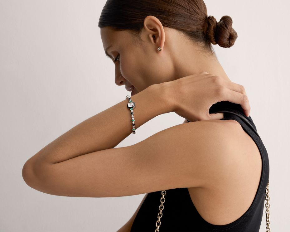 ดีไซน์โดดเด่นด้วยการประดับเพชร กว่า 380 เม็ดบนส่วนกำไลโค้ง และอีก 171 เม็ดบนตัวเรือนทรงวงรี หน้าปัดครอบด้วยกระจกแซฟไฟร์ทรงโดม เผยพื้นผิวสีเงินเสริมด้วยตัวเลขโรมันสีเทาเข้ม เข็มทรงดาบสีน้ำเงินหมุนผ่านมอบแสงระเรื่อสีฟ้าอย่างงดงาม ตัวล็อกเปิดด้วยปุ่มกดสองข้างและกลมกลืนไปกับเส้นขอบโค้งของกำไล ขณะที่เม็ดมะยมตกแต่งด้วยเพชรเม็ดเดียวเป็นจุดนำสายตาอย่างพอดี