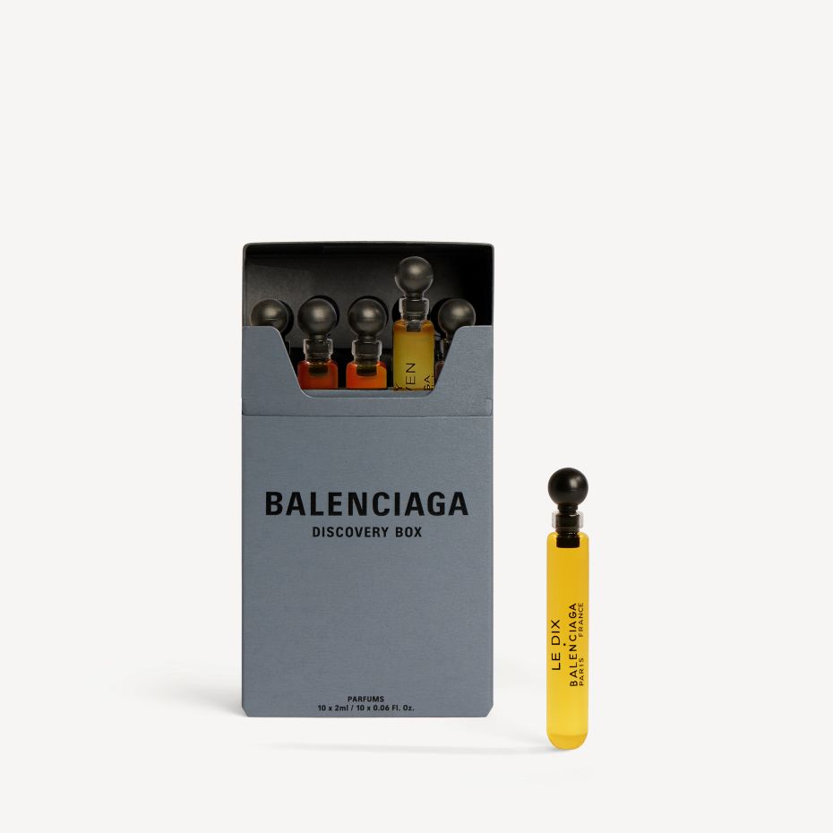 ภาพสแกนขวดน้ำหอมในคอลเล็กชั่นบนพื้นหลังสี Industrial Grey อันเป็นเอกลักษณ์ของ Balenciaga สะท้อนถึงน้ำหอมทั้ง 10 กลิ่นในคอลเล็กชั่นนี้ ได้แก่ No Comment, Getaria, Twenty Four Seven, To Be Confirmed, Muscara, Le Dix, 100%, Extra, Cristóbal และ Incense Perfumum พร้อมด้วยภาพประกอบของบรรจุภัณฑ์และวัตถุดิบหลักของแต่ละกลิ่น
