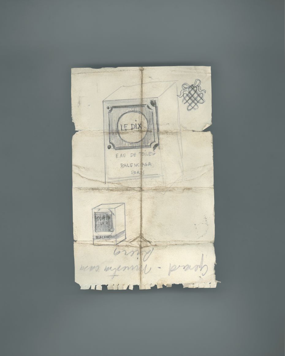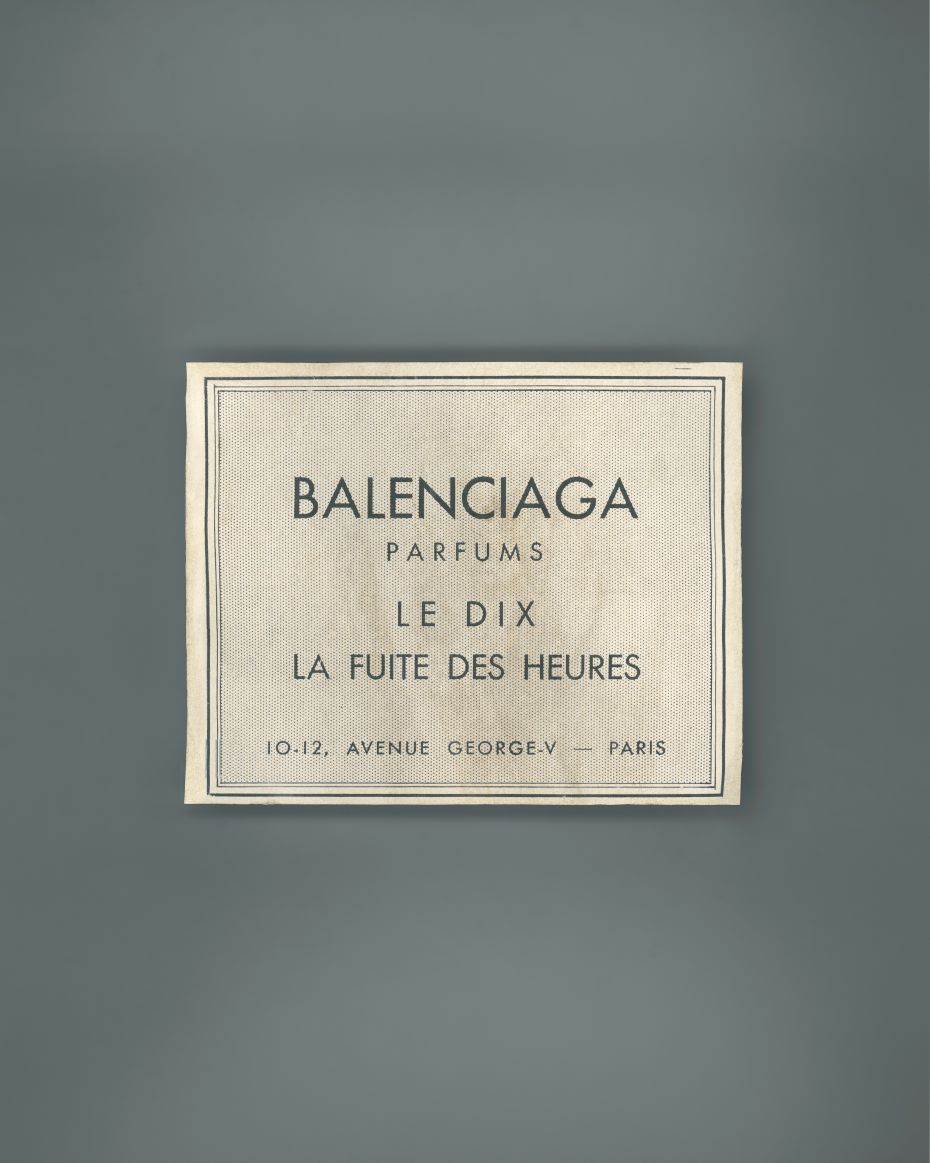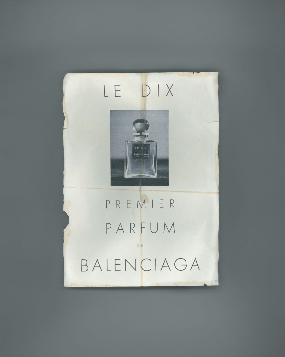 ภาพของแคมเปญนำเสนอเอกสารสำคัญจากคลังอาไคว์ รวมถึงภาพร่างบรรจุภัณฑ์ต้นแบบ การออกแบบขวด และโฆษณาของ Le Dix เน้นย้ำถึงความเคารพอย่างลึกซึ้งต่อมรดกของ M.Balenciaga ที่เป็นหัวใจสำคัญอันเป็นเอกลักษณ์ของ Balenciaga