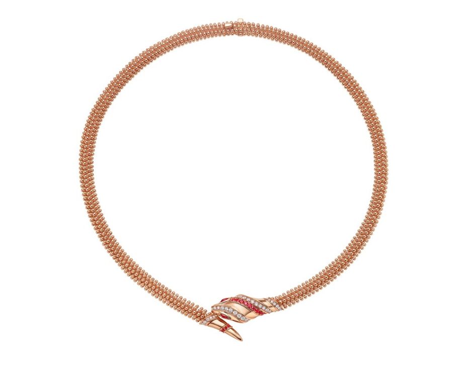 เติมเต็มความสมบูรณ์แบบให้กับการเปิดตัวครั้งนี้ ด้วยสร้อยคอรุ่นพิเศษซึ่งเป็นการตีความอันทรงเสน่ห์สะกดใจในทองคำโรสโกลด์ที่ประดับตกแต่งด้วยทับทิมและเพชร ทั้งบนหัวและหางของงู รังสรรค์เป็นมิติอันล้ำค่าและดึงดูดใจ ทั้งยังเสริมด้วยความเย้ายวนสะกดสายตาด้วยดวงตาทับทิมที่ถ่ายทอดความน่าหลงใหลให้กับสัตว์แห่งตำนานนี้ได้อย่างไร้ที่ติ พร้อมเปล่งประกายด้วยรัศมีแห่งการแสดงออกอันสดใสและเต็มไปด้วยชีวิตชีวาของพลังแห่งการเปลี่ยนแปลง