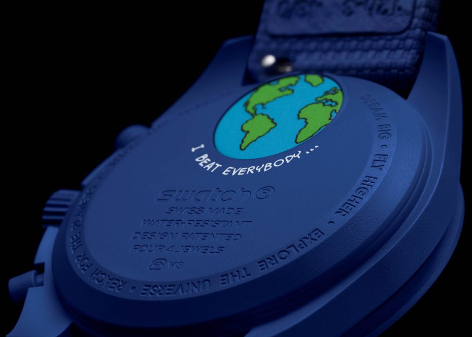 นอกจากนี้ ยังโดดเด่นด้วยฟีเจอร์สุดไอคอนิกมากมายของนาฬิกา Speedmaster Moonwatch ในตำนานของ OMEGA รวมถึงตัวเรือนแบบอสมมาตร และมาตรวัดความเร็วที่มีจุดเหนือเลขเก้าสิบอันโด่งดัง โลโก้ OMEGA X Swatch โดดเด่นเป็นสง่าตรงหน้าปัดและเม็ดมะยม ส่วนข้อความพันธกิจก็สลักอยู่ตรงฝาหลังตัวเรือน ฝาครอบแบตเตอรี่ยังมีดีไซน์จากผืนโลก ส่วนสายนาฬิกายาง VELCRO@ สีกรมทำก็แฝงด้วยความเท่แบบฉบับนักบินอวกาศ