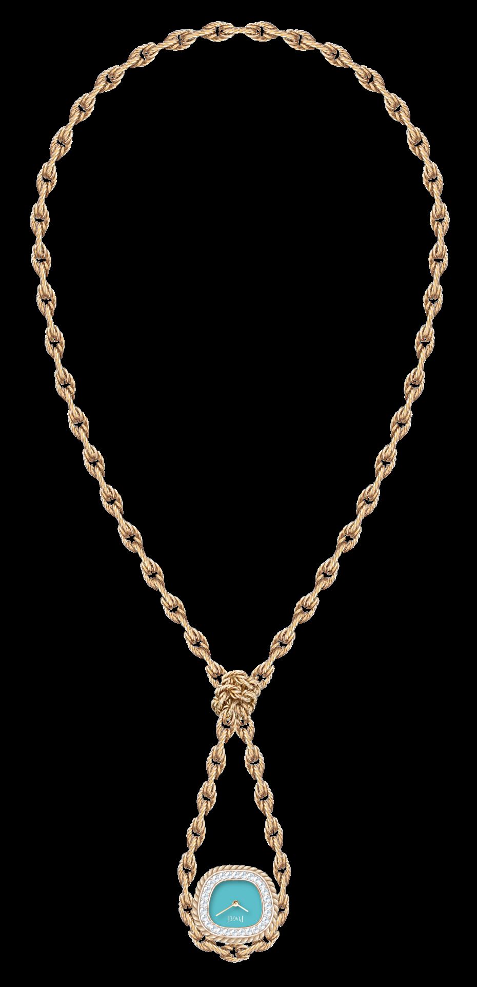 Sixtie Swinging Sautoir (G0A50351) คือนิยามของมรดกแห่งการสร้างสรรค์นาฬิกาในแนวอาวองการ์ด และความเชี่ยวชาญด้านสีสันของ Piaget ซึ่งผลงานชิ้นใหม่นี้ ได้รับแรงบันดาลใจจากภาพสเก็ตช์ต้นแบบบนหน้านิตยสารแฟชั่นในอดีตอันเป็นภาพของหญิงสาวที่สวมใส่สร้อยสีทองพร้อมจี้ที่เป็นนาฬิกาหน้าปัดสีฟ้าเทอร์ควอยซ์ ซึ่งภาพดังกล่าววาดโดยดีไซเนอร์ของเมซง ก่อนที่จะรังสรรค์เป็นสร้อยคอยาว ประดับนาฬิกาหน้าปัดเทอร์ควอยซ์ทรงสี่เหลี่ยมคางหมู สะท้อนเสน่ห์แห่งความงามหรูหราอย่างเป็นธรรมชาติของยุคสมัยนั้น เส้นสายทองคำที่บิดเกลียวด้วยมือและประดับเพชรเรียงร้อยลงมาอย่างอ่อนช้อย คล้ายระลอกคลื่นอันอ่อนโยนบนผิวน้ำ ขับให้ชิ้นงานดูมีชีวิตชีวายิ่งขึ้นเมื่อพู่เพชรและทองสะท้อนประกายระยิบระยับพลิ้วไหวไปตามแสง